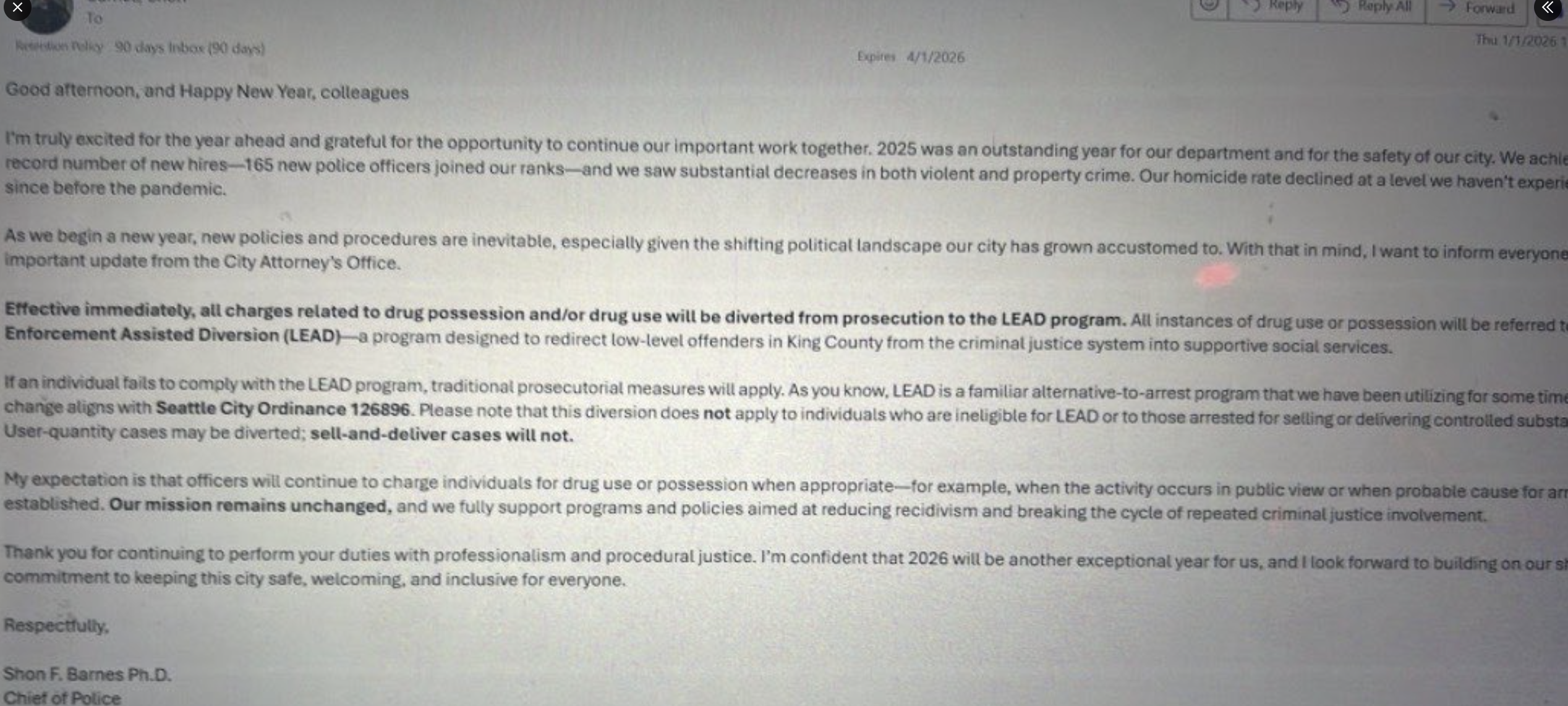 Seattle Police Chief Shon F. Barnes notified his officers of these changes in a memo soon after Wilson’s inauguration on January 2. He wrote, “Effective Immediately, all charges related to drug possession and/or drug use will be diverted from prosecution to the LEAD program.”